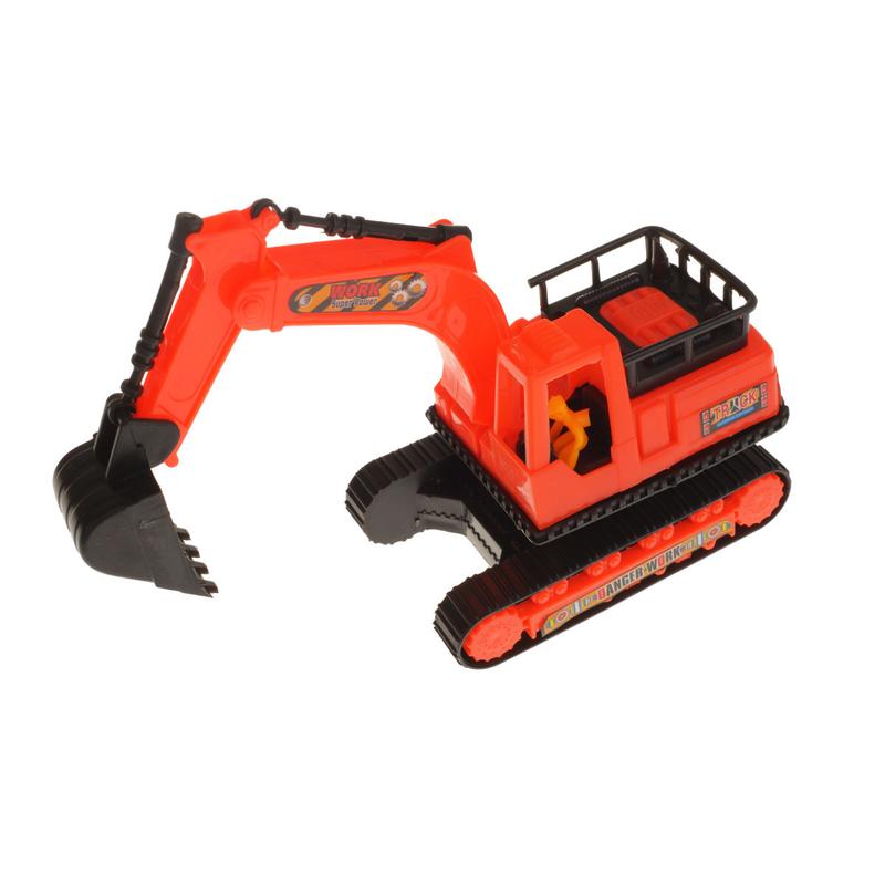 Екскаватор - червона гусенична будівельна землерийна машина з ковшем, яка призначена для гри дітям від 3-х років. Завдяки непомітній колісній платформі під днищем екскаватора він легко пересуватиметься рівною поверхнею. Ковшовий механізм виконаний подібним до реального екскаватора, що дозволяє під час гри по справжньому забирати до ковша дрібні іграшки та вантажити їх у кузов автомобіля. Екскаватор виготовлений з пластику. Габаритні розміри: довжина - 17 см, висота - 8,5 см, ширина - 6 см.