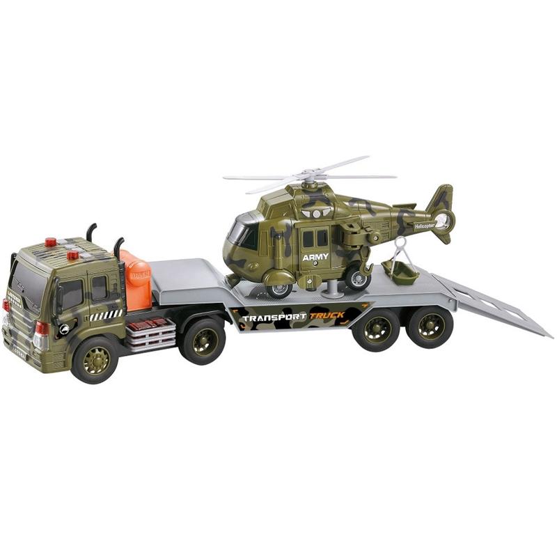 Инерционный автовоз с вертолетом новинка в нашем онлайн -- магазине. Кнопки на крыше автовоза воспроизводят различные звуковые эффекты, звук мотора, клаксон, задний ход, мигание лампочек. Автовоз перевозит на себе инерционный вертолет, который, имеет подвижную лебедку с корзиной можно опускать и поднимать разный груз. При нажатии рычага на вертолёте, вращается пропеллер. Свет и звук работают от 3 батареек типа AG13 (входят в комплект). Масштаб модели 1:16. Размер вертолета 21 * 7 * 11 см. Размер автовоза 38 * 8 * 15 см. Размер коробки 42 * 12 * 19 см.