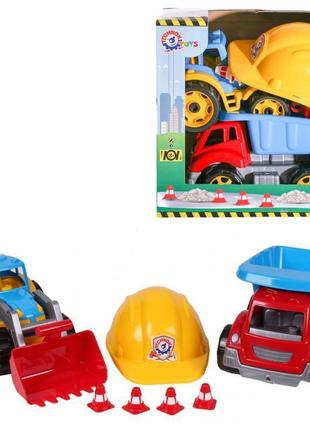 Іграшковий набір "Малюк - будівник 2". Комплектація - самоскид з відкидним кузовом, трактор з ковшем, дорожні конуси, каска. Матеріал - пластик. Упаковка - коробка. Розмір - 38х37х62 см.
