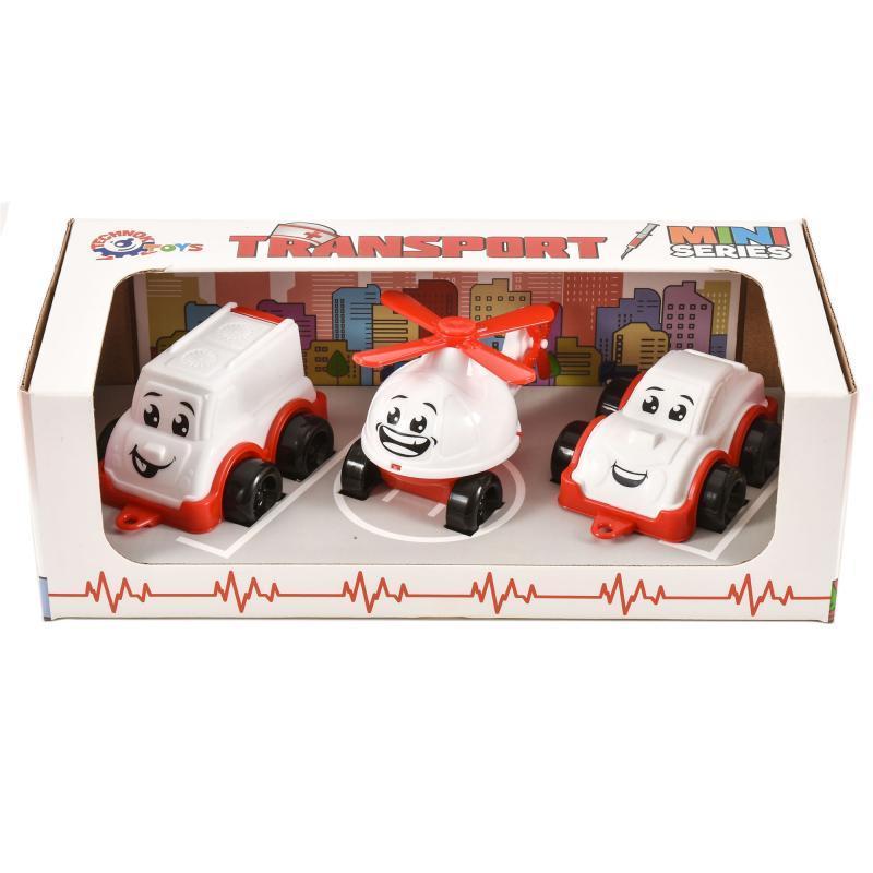 Іграшка "Служба швидкої допомоги Міні". Набір 3-х яскравих моделей: 2 авто та вертоліт. Матеріал - пластик. Вік - від 3 років. Упаковка - коробка. Розмір - 26.4х12х9 см.