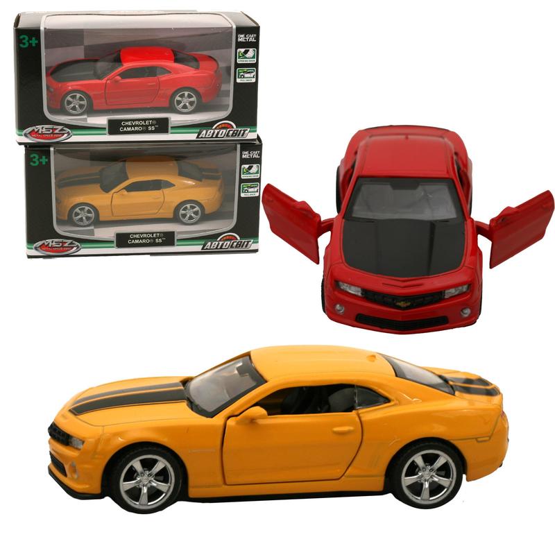 Іграшка "Chevrolet Camaro", 11 см, 2 кольори. Масштаб — 1:43. Металева колекційна модель. Інерційний механізм. Гумові колеса, відкриваються двері. Паковання — коробка. Розмір - 14,5х6,5х7 см.