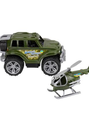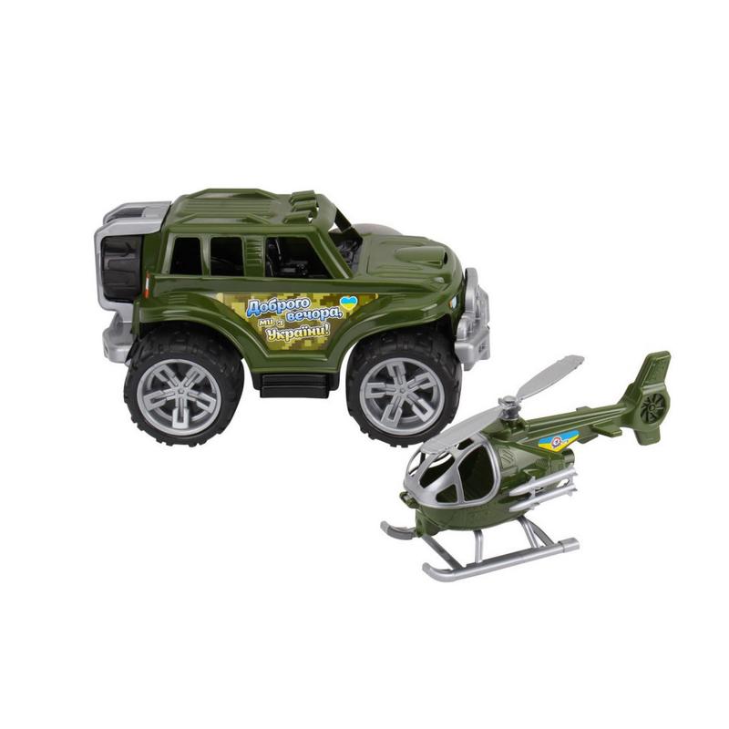 Мощный большой внедорожник и быстрый маневренный вертолет в военном наборе от ТехноК. Это уже хорошо знакомый и любимый вами джип и наша новинка - военный вертолет. На фюзеляже воздушная птичка несет боевые ракеты. Кабина открывается для пилота-призрака. Внедорожник украшен цветной наклейкой "Добрый вечер, мы из Украины" на пиксельном фоне. Защитный цвет - хаки. Упаковка: вертолет прикреплен стяжкой на крыше внедорожника (без сетки).