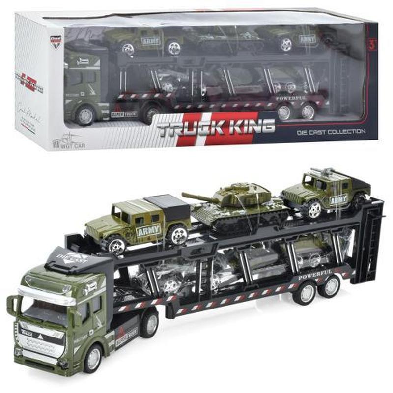 Іграшка "Військовий трейлер". Трейлер 32 см та металева військова техніка, 6 шт. Інерційний механізм руху. Упаковка - коробка. Розмір - 37х7х11 см.