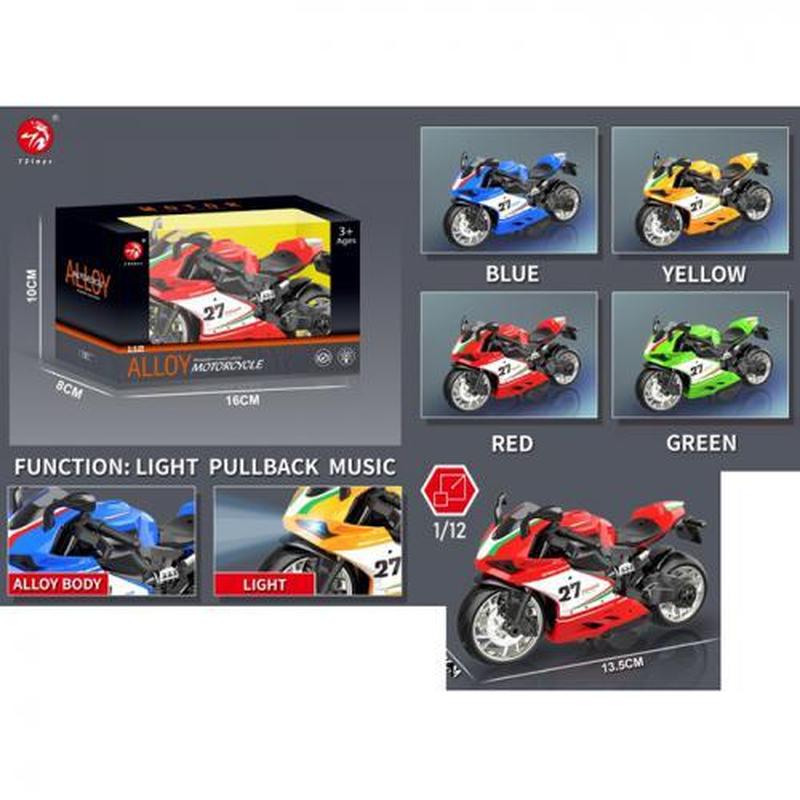 Іграшка "Мототранспорт", 13,5 см, 4 кольори. Масштаб - 1:12. Інерційний рух. Є звуки та світло. Живлення - батарейка типу таблетка. Матеріал - метал. Упаковка - коробка. Розмір - 16х8х10 см.