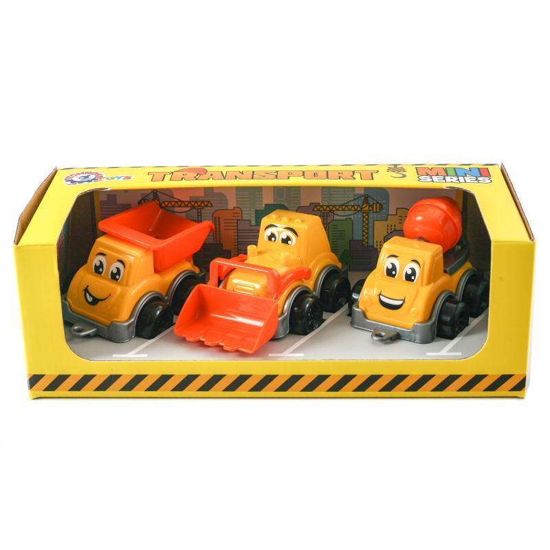 Іграшка "Будівельна техніка Міні". Набір 3-х яскравих автомобілів. Матеріал - пластик. Вік - від 3 років. Паковання — коробка. Розмір - 26.4х12.2х9 см.