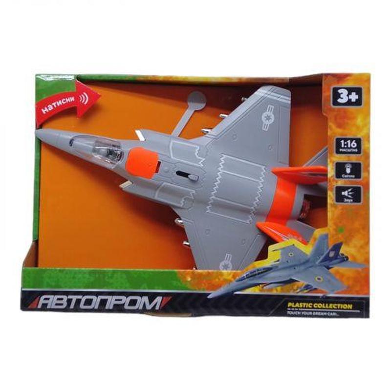 Іграшковий винищувач зі світловими та звуковими ефектами. При перемиканні важеля зверху, на даху літака відкривається відсік з турбіною, включається підсвічування та звукові ефекти. Літак видає звуки польоту та стрілянини. Іграшка інерційна, має прогумовані задні колеса. Розмір: 32х23х10 см. Бренд: Автопром Упаковка: Коробка Колір: Сірий Ел-ти живлення в комплекті: Так Вага з упаковкою: 435 г Габарити в упаковці: 9 x 32 x 23 см Габарити без упаковки: 10 x 32 x 23 см Країна виробник: Китай Матеріал: Комбінований Комплектація: Літак