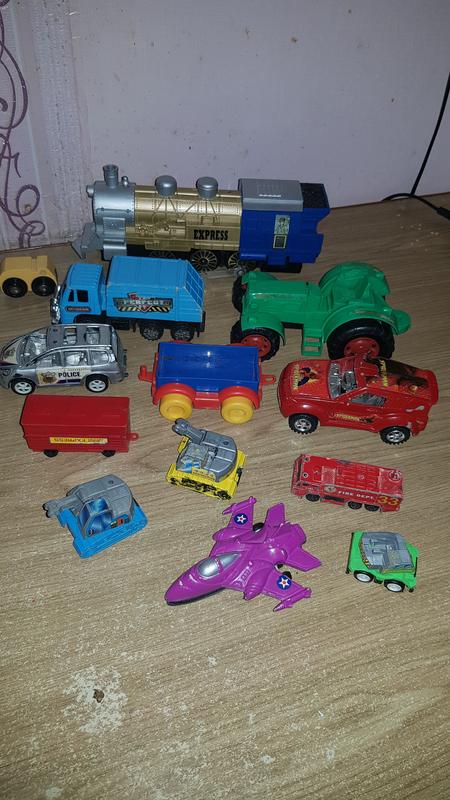 Все с дефектами. В большинстве подерта краска, колеса все цели. Поезд когда-то работал от батареек, но потерялась крышка, где были также контакты и с одной стороны отломанная штучка на колесах. Маленькая желтая машинка фирменная, без дефектов (если только ее, то 40грrн)