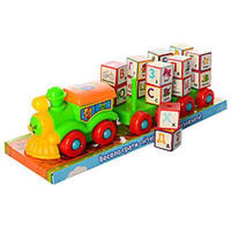 дитячий паровоз Метр Плюс, 36см, з причепом, літери-кубики (українські), на мотузці, у слюді 38-12-11см,