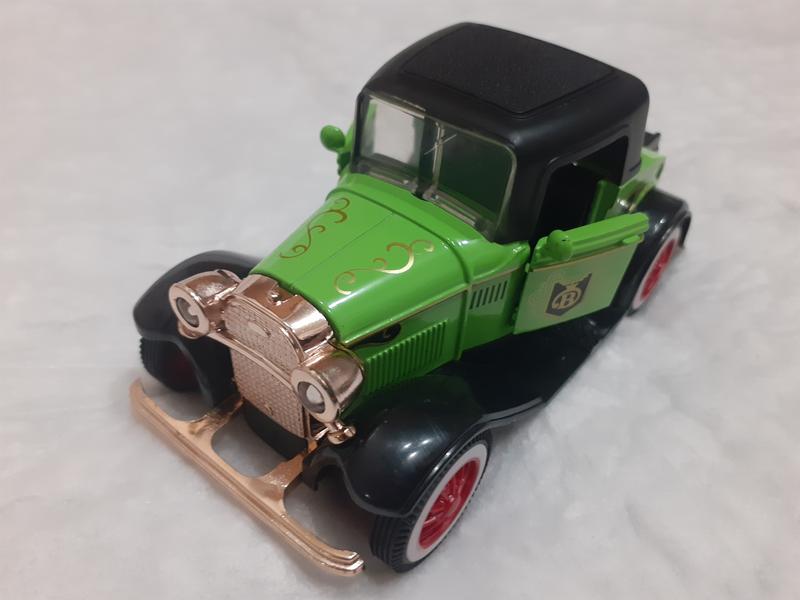 Автомобиль: классический винтажный, инерционный. Цвет: салатовый. Масштаб: 1:32. Материал: салатовая основа из сплава, резина (колеса) и пластик (золотой бампер, черная крыша).