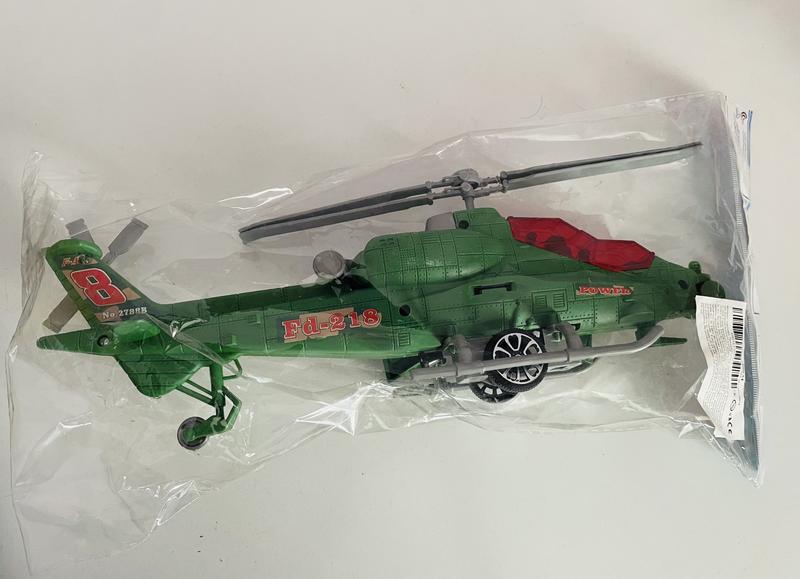 Интерактивный пластиковый вертолет. Крутится верхний пропеллер. Вертолет Длина 30 см. Высота 10 см. Ширина 6,5 см.