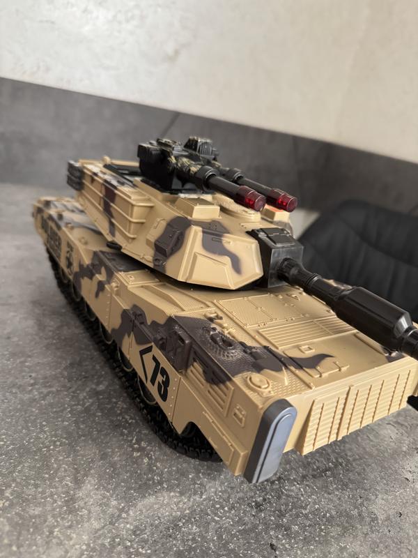 В дуже хорошому стані, без пульта керування Звуки видає при натисканні на кнопки, батарейки потрібно замінити Довжина 51 см обертання башти на 360 градусів