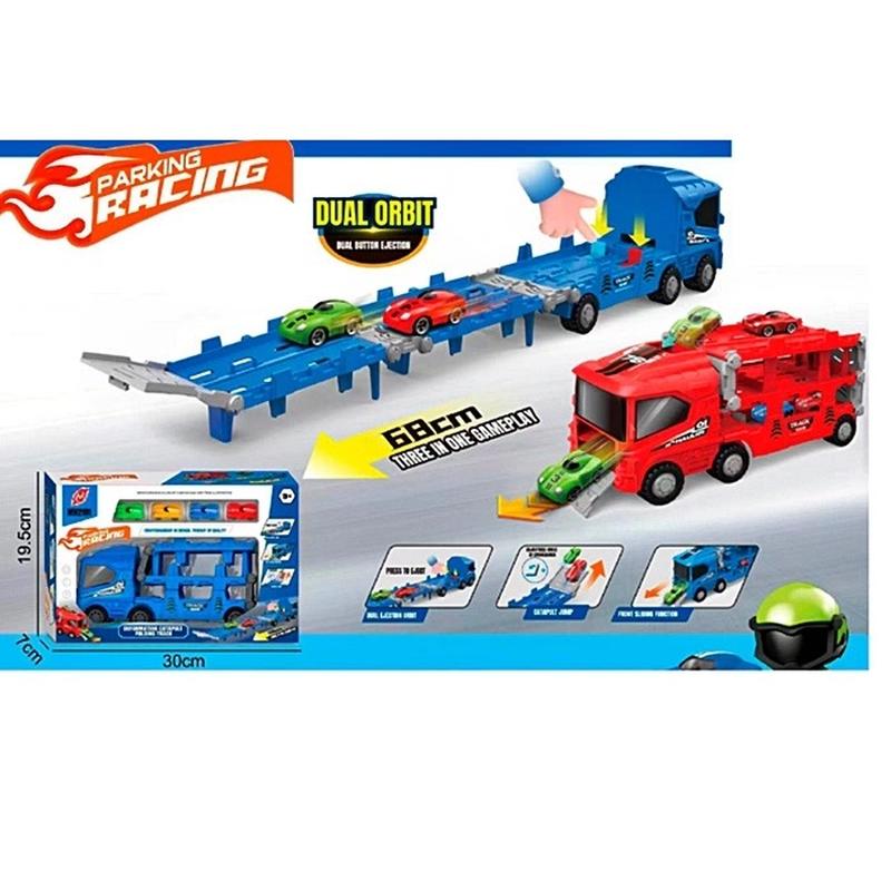 Трейлер "Hot Wheels" MH2101 2 кольори, 2-х поверх., машинки 4шт, гараж-автотрек, трамплін, запуск. механізм, рухомі деталі, з аксесуар., в коробці 30*20*7см