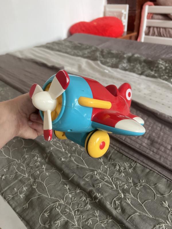 Класна іграшка . Коли штовхати проведемо крутиться . Якщо потягнути іграшку назад і відпустити літак іде сам . Трошки щось всередині прокручується і тріскотить . Так було незнаю чи має так бути взагалі