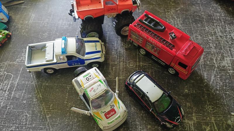 Металлические машинки все, что на фото. Машинки целые, колесами.Из нюансов имеют потертости краски. В подарок, по желанию полицейская машинка, у нее нет шин)
