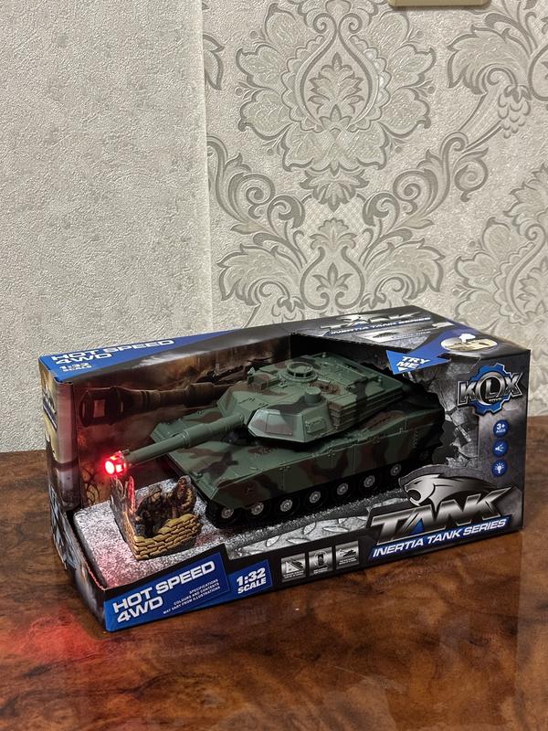 Інерційний танк . Для юного захисника бойовий танк стане першим знайомством із військовою технікою. Ця іграшка буде користуватися популярністю в хлопчиків завдяки своєму дизайну та функціональним можливостям. Танк обладнаний чотирма парами потужних коліс і вміє долати певну відстань самостійно за допомогою механізму інерційного руху. Завдяки шинам, танк може їздити по шорсткій поверхні вгору під кутом 45°. Гармата танка також має цікаві функції. Вежа вміє провертатися на 360°, а гармата, встановлена на ній, рухається вгору та вниз. Крім цього, дуло гармати світиться вогником. Функціонування іграшки супроводжується звуковими ефектами. Запуск ефектів відбувається завдяки кнопці, що знаходиться на його вежі. Масштаб модели: 1/32. Працює від батарейок, які входять до комплекту. Розмір упаковки 28-13-12 см
