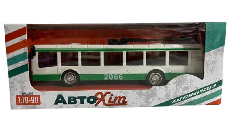 У троллейбуса двери открываются, инерционный механизм и усики можно поднимать или опускать. Масштаб: 1:70-90 Длина троллейбуса: 17 см. Материал: пластик, металл. Размер коробки: 19х7, 5х6 см.