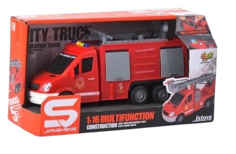 Пожежна машина (JS 139-40-2) Машина виготовлена з червоного пластику. На даху машинки розташовані габаритні вогні, вони світяться, а не тільки прикрашають автомобіль. Дитяча пожежна машинка має світлові та звукові ефекти, рухомі деталі. • Масштаб: 1:16 • Довжина машинки: 27 см • Виготовлено з пластику • Гумові колеса • Бризкає водою • Звукові ефекти • Світловий супровід • Працює від батарейок батарейки (таблетки AG13/LR44 3шт в комплекті) Габарити: 33-17-13