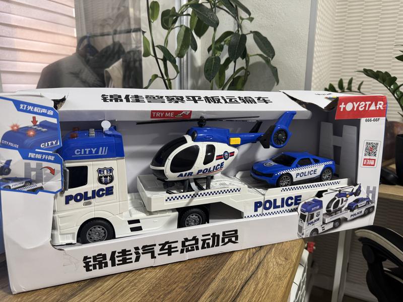 У комплекті — велика поліцейська фура-автотранспортер, стильна поліцейська машинка та гелікоптер Air Police. Набір оснащений світловими та звуковими ефектами — сирена, маячки, підсвітка. Кнопка TRY ME дозволяє протестувати функції просто у коробці. Характеристики: Тип: набір поліцейської техніки 3-в-1 Комплектація: фура, поліцейська машинка, гелікоптер Ефекти: світло + звук Матеріал: міцний литий пластик Живлення: батарейки Вік: 2+ Розмір коробки: орієнтовно 45–50 см *дефект коробки, видно на фото Можлива доставка Новою поштою, Укрпоштою