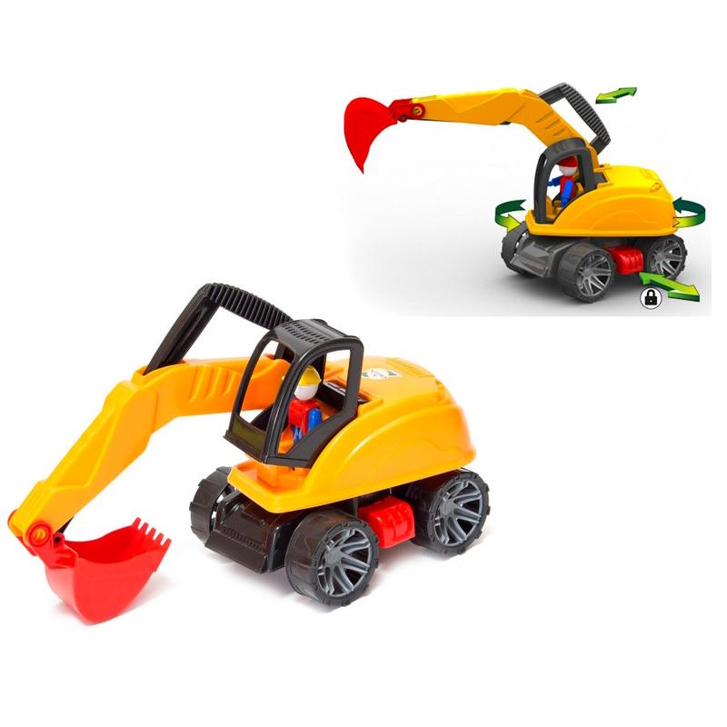 Машинка экскаватор на 4-х колёсном шасси. Стрела экскаватора с ковшом управляется с помощью рычага. Платформа вращаться на 360 градусов вокруг оси и может фиксироваться с помощью фиксатора. В кабине имеется игровая фигура водителя. Размер экскаватора: 39х26х16 см.