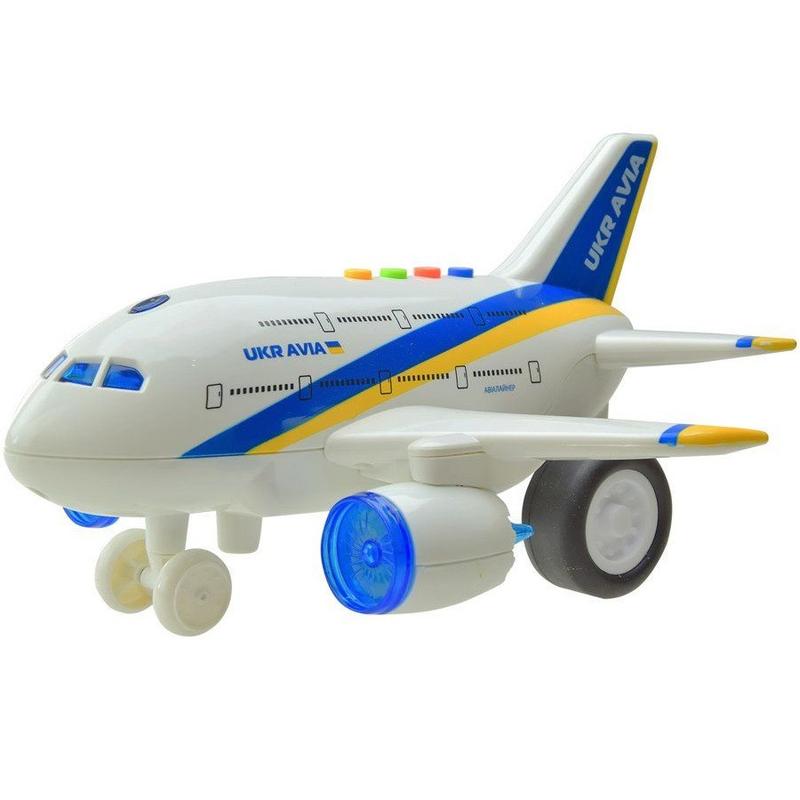 Игрушечный самолет Ukr Avia белого цвета изготовлен из пластика. Четыре колеса обеспечивают устойчивость на гладкой поверхности. На корпусе самолета расположены 4 разноцветных кнопки. При нажатии на них мигает голубая подсветка с окон и двигателя, а также звучат разные звуки. Самолет имеет инерционный принцип движения. Озвучен на английском языке. Масштаб игрушки 1:160. Размер самолета 24 * 23 * 14 см. Размер коробки 26 * 18.5 * 16 см.