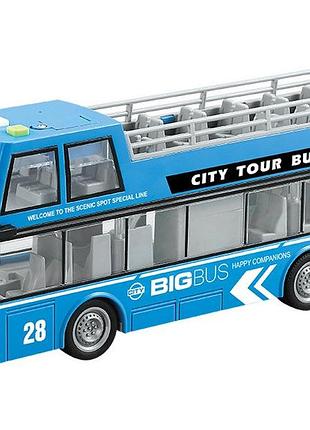 Игрушка является уменьшенной копией настоящего двухэтажного туристического автобуса. Автобус имеет открытую верхнюю площадку для обзорных экскурсий, открывающиеся двери и прорезиненные колеса. Внутри салона и на верхней площадке расположены ряды пассажирских кресел. Автобус дополнен звуковыми и световыми эффектами, которые работают от 3 батареек 1.5V AG13. При нажатии на 3 кнопки на крыше у автобуса мигает подсветка салона, звучит музыка. Около дверей расположенные крутилки, покрутив открываются и закрываются двери. Имеет инерционный принцип движения. Масштаб модели 1:16. Размер автобуса 29 * 7 * 11 см. Размер коробки 32 * 11 * 19 см.