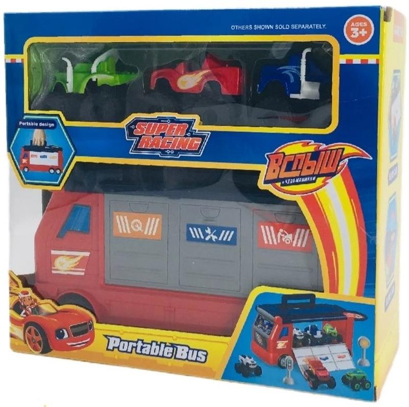 Фургон кейс Вспыш с тремя героями. Главные герои могут заночевать в доме на колесах. Автобус открывается с боку, имеет три дорожки для съезда. Так же машинки могут находиться на крыше автовоза. Имеется вертолетная площадка. Ручка для удобного перемещения фургона. Длинна фургона 27 см. Длинна машинок 7 - 8 см. Размер коробки 29 * 13 * 27 см.