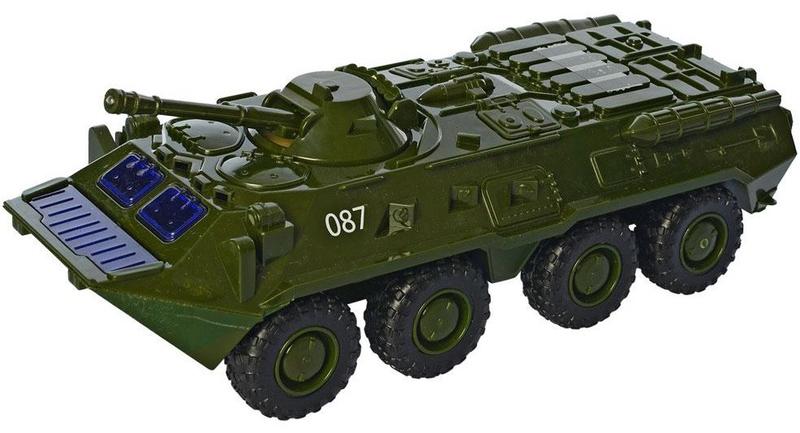 Бронетранспортер оснащен классическим инерционным механизмом. Башня поворачивается на 45° в каждую сторону. Ствол пулемёта можно поднимать -- опускать. При нажатии кнопки на башне, воспроизводятся звуки стрельбы и в стволе пульсирует красный свет, имитируя выстрелы. За башней расположены два открывающихся люка и ракета, при нажатии на которую в задней части БТР распахиваются створки ракетного отсека и "выстреливает" светящаяся ракета с соответствующим звуком запуска. Масштаб модели 1:35. Размер машинки 25 * 11 * 9 см. Размер упаковки 28 * 12 * 12 см.