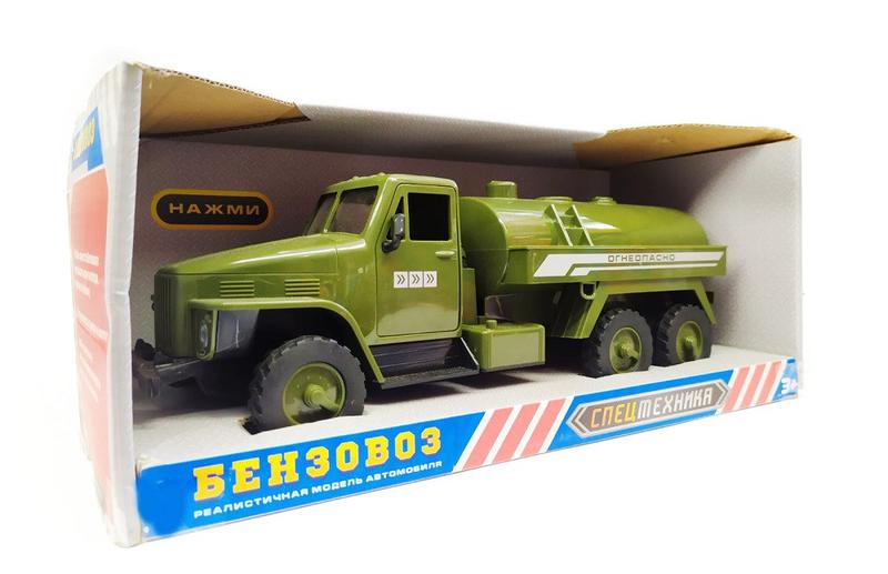 Игрушечная спецтехника, реалистичная модель автомобиля -- бензовоз. Машинка сделана из прочного пластика защитного зеленого цвета. Работает от батареек (в наборе). открываются передние двери, поднимается капот.