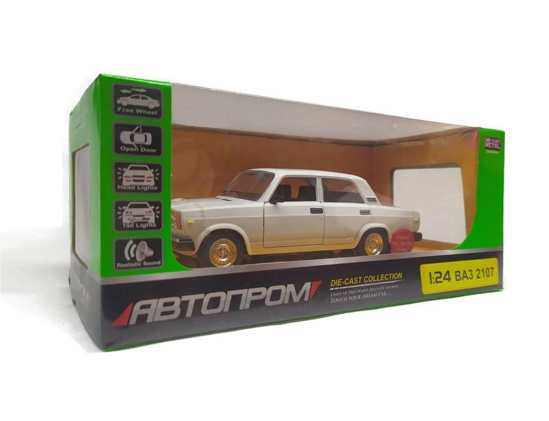 Металлическая модель отечественного автомобиля ВАЗ 2107 белого цвета. В машинке открываются передние двери, поднимается капот и крышка багажника. В игрушечных жигулях присутствуют звуковые и световые эффекты. Машина оснащена инерционным механизмом. Размер игрушки: 18 см