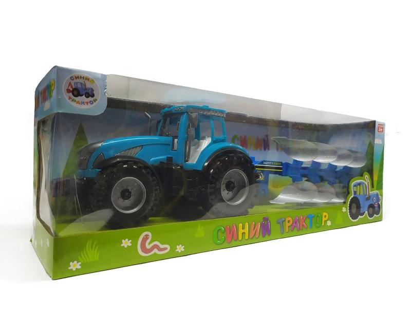 Музыкальный синий трактор с прицепом плугом. При нажатии на кнопочки, которые находятся на крыше трактора воспроизводятся звуки мотора и сигнал клаксона. Размер игрушки: 43 см