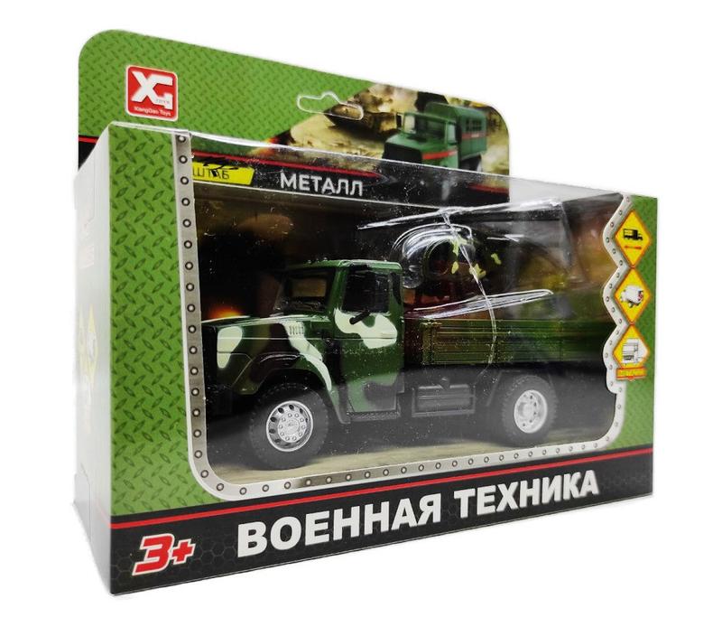 Металлическая модель военного грузового автомобиля ЗИЛ 4331 с вертолетом. Машинка инерционная. Масштаб 1:43