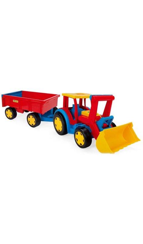 Яркий пластиковый трактор с подвижным ковшом, прицепом и большими колёсами. Изготовлен из качественного пластика. Ребёнок может кататься верхом на тракторе. Грузоподъёмность трактора - 100 кг, прицепа - 60кг._ Бренд: Wader Упаковка: Коробка Цвет: Разноцвет Вес в упаковке: 4000 г Габариты в упаковке: 55 x 32 x 60 см Cтрана производитель: Китай Материал: Пластик Комплектация: Трактор, прицеп