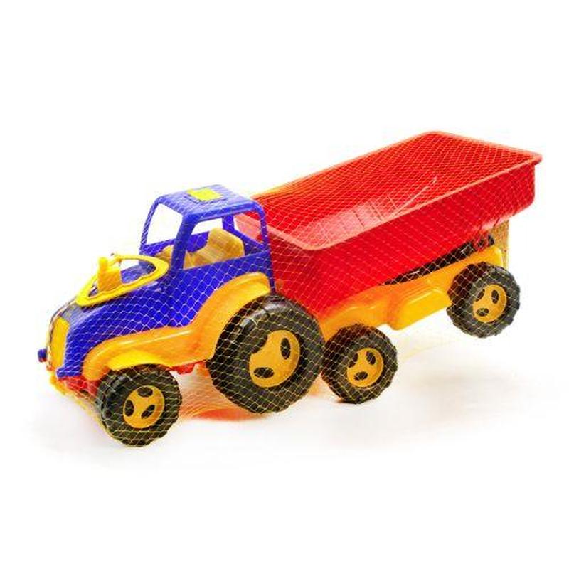 Пластиковый трактор с большим прицепом, в котором можно перевозить песок, камни или игрушки. Спереди трактора предусмотрен шнурочек с ручкой, с помощью которого его удобно тащить за собой._ Бренд: Максимус Упаковка: Сетка Цвет: Синий Тип эл-тов питания: Нет Эл-ты питания в комплекте: Нет Вес в упаковке: 1135 г Габариты в упаковке: 23 x 56 x 21 см Cтрана производитель: Украина Материал: Пластик Комплектация: Трактор, прицеп