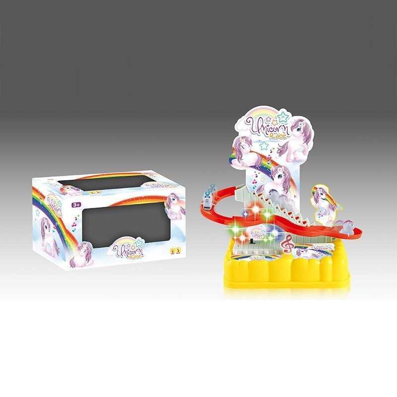 Волшебный трек с единорогами для детей Этот яркий трек 0912-7 создан для увлекательных игр детей от 3 лет. Три красочные фигурки единорогов спускаются по дорожке с яркой подсветкой и музыкальным сопровождением. Автоматический подъёмник возвращает фигурки в начало трека, обеспечивая непрерывную игру. - Автоматический подъёмник для фигурок - 3 яркие фигурки единорогов - Яркая световая подсветка - Музыкальное сопровождение для создания атмосферы - Работает от 2 батареек типа АА (в комплект не входят) - Изготовлен из безопасного пластика - Подходит для детей от 3 лет - Компактный размер и лёгкий вес
