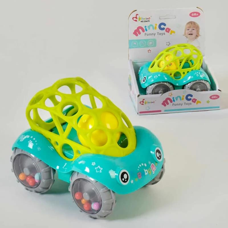 Яркая машинка-погремушка для малышей от 6 месяцев Эта красочная игрушка в форме машинки изготовлена из безопасных материалов и оснащена резиновой сферой, внутри которой находится погремушка в виде разноцветных шариков. Благодаря компактным размерам малыш сможет легко держать машинку в руках. - Развивает мелкую моторику рук - Способствует развитию сенсорного восприятия - Улучшает аудиовизуальное восприятие ребенка - Идеальна для игр детей от 6 месяцев - Безопасные материалы и приятные цвета