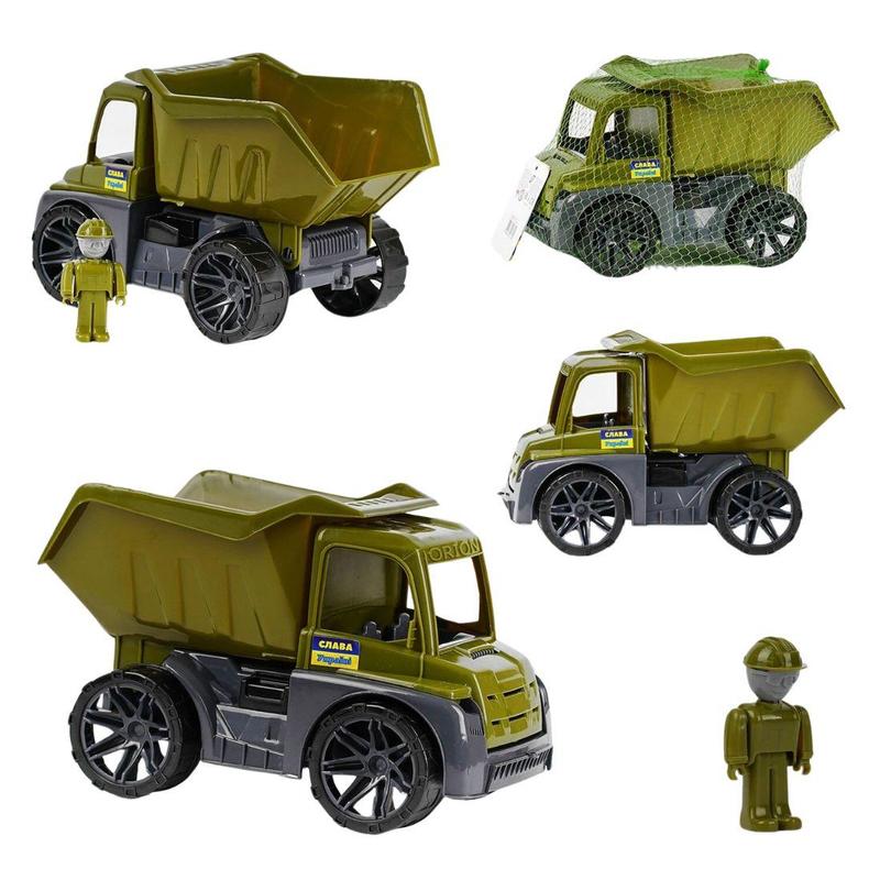 Особенности: - откидной борт; - размер: 28х16х17,5 см; - игрушка изготовлена из качественного первичного пластика; - украшена яркой наклейкой; - откидная кабина; – в комплекте представлена фигурка водителя.