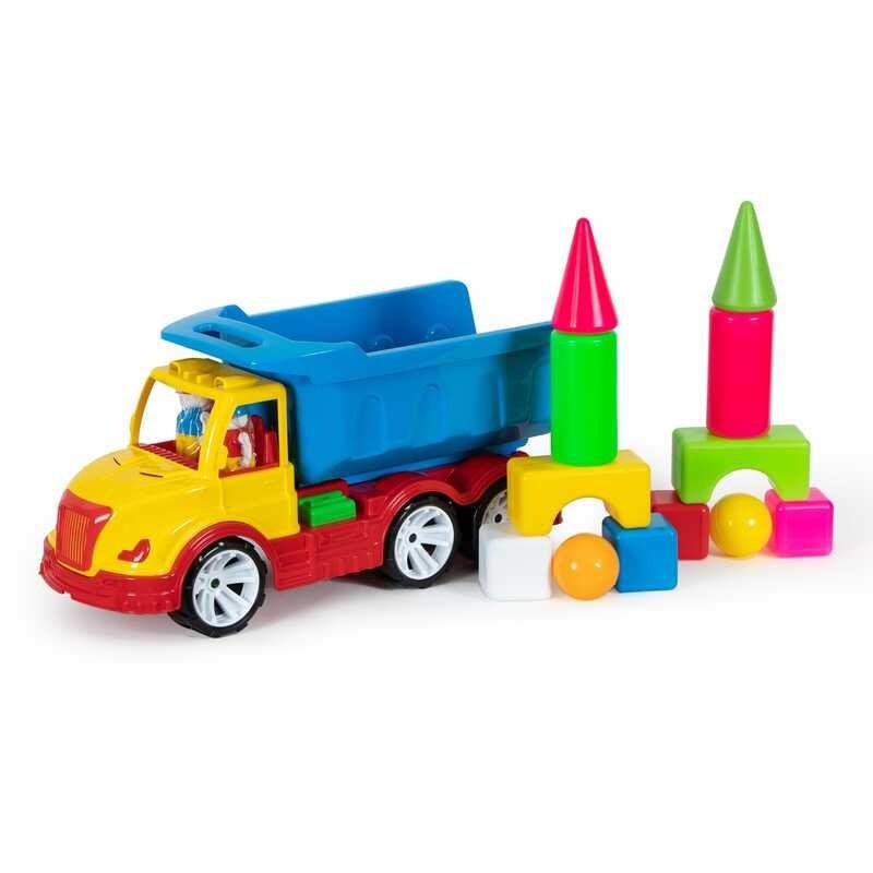 Большой и невероятно крутой, яркий и стильный самосвал станет украшением любой коллекции игрушечного транспорта. У автомобиля большой откидной кузов, в котором удобно перевозить любой груз. Машинка укомплектована набором строителя, в котором малыш найдет кубики, шарики, цилиндры, арку и конусы, а значит, играя с набором, карапуз познакомится с большим количеством геометрических форм. Это позволит Вашему ребенку использовать их в качестве конструктора, построить огромный замок, неприступный форт или другие оригинальные здания.