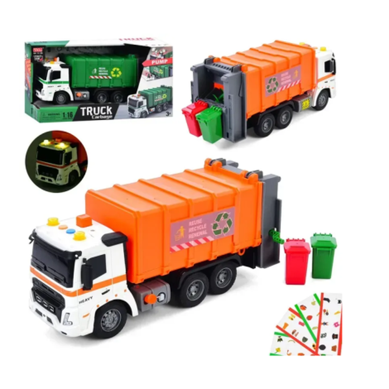 Машина инерционный мусоровоз A1110-3-13 - перед заказом, пожалуйста, уточняйте наличие (оптовый состав). грашечный мусоровоз A1110-3-13 – это реалистичная модель спецтехники, созданная для увлекательных сюжетных игр. Машинка выполнена в масштабе 1:16, имеет подвижные детали, позволяющие полностью воспроизвести процесс загрузки и вывоза мусора. Доступна в 2 цветах. Особенности игрушки: Инерционный механизм – машинка легко едет вперед после небольшого толчка. Музыка и свет – яркие световые эффекты и звуки делают игру еще интереснее. Подвижные элементы кузова – можно поднимать и опускать контейнер, загружать баки. 2 мусорных бака в комплекте (зависит от модификации). Качественные материалы и детализация спецтехники. Работает от батареек (входят в комплект или прилагаются отдельно в зависимости от партии). Характеристики: Масштаб: 1:16 Функции: инерциональный ход, свет, звук, подвижные детали Размер коробки: 32,5 × 17 × 13 см Идеальная модель для маленьких любителей техники, ролевых игр и обучения основам сортировки мусора.