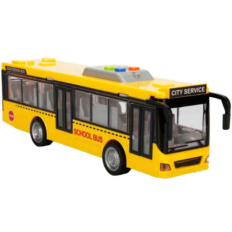 Модель автобуса дополнена звуковыми и световыми эффектами, которые работают от 3 батареек 1.5V AG13. При нажатии на кнопки на крыше автобуса мигает подсветка салона, звучит музыка. У двери расположены крутилки, покрутив открывающиеся и закрывающиеся двери. Имеет инерционный принцип движения. Игрушка изготовлена из пластмассы. Масштаб модели 1:16. Размер автобуса 28 * 7 * 9 см. Размер коробки 32 * 11 * 17 см.