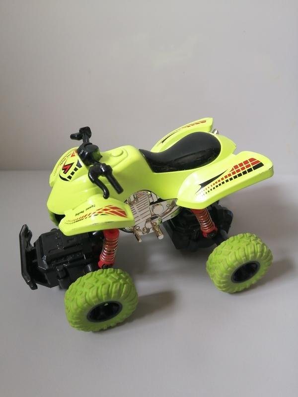 Игрушечный квадроцикл. Тип игрушки: Модель квадроцикла. Особенности: Яркий зеленый цвет, черные детали, пружинная подвеска. Возрастная группа: Обычно предназначены для детей от 3 лет. Материал: метал