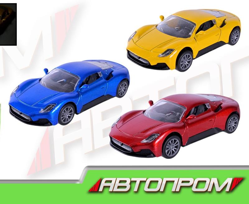 Іграшка "Спортивне авто", 3 кольори. Масштаб - 1:32. Розмір авто - 12х5х2,5 см. Відчиняються двері, світяться фари. Живлення - батарейки типу таблетка. Матеріал - метал. Упаковка - коробка. Розмір - 15х6,5х7 см.