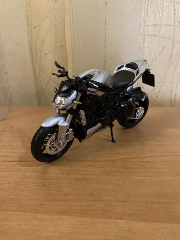 Мотоцикл игрушечный спортивный металлопластиковый. Уменьшенная копия скоростного байка. Модель отлично детализирована в масштабе: 1:12. Особенности модели: металлопластиковый корпус, пружинная подвеска заднего колеса, подвижный руль, функциональная подножка. Размер мотоцикла: 18*6*9 см. Размер упаковки: 21,5*7*12 см. Игрушка новая.