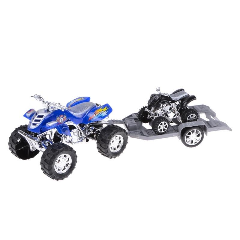 Потужний квадрацикл з причепом, розрахований на їзду по самому непрохідному бездоріжжю. На причепі вмістився маленький мотоцикл - мабуть його щойно витягли з ями. Це лише один варіант гри, який реально припустити за допомогою даного набору. Крім того, кожну іграшку можна використовувати і окремо. Квадрацикл володіє інерційним механізмом: розганяється вручну, а далі їде самостійно. Може проїхати і по м'якому килиму. На причіп можна помістити будь- який вантаж, а мотоцикл використовувати спільно з іншими іграшками. Транспорт - універсальні іграшки, за допомогою яких будь-яка гра буде яскравою і цікавою.