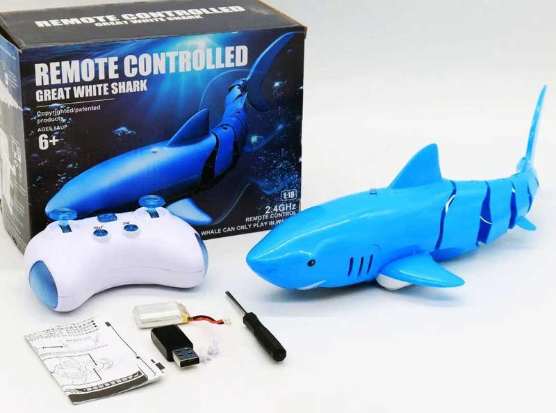 Интерактивная игрушка Акула на радиоуправлении Shark с пультом, Аккумулятор 500 mah Радиоуправляемая игрушка "Акула" Shark - это захватывающая игрушка, спроектированная для того, чтобы приносить удовольствие и веселье как детям, так и взрослым. Акула имеет выдающийся дизайн, который делает ее похожей на настоящую акулу. Это создает визуальную привлекательность и приносит дополнительное веселье в игровой процесс. Снабжена простым в использовании пультом дистанционного управления, который обеспечивает легкое управление движением акулы. Это позволяет детям и взрослым легко маневрировать игрушкой в разных направлениях. Детская игрушка выполнена с учетом водонепроницаемых свойств, что позволяет использовать ее в воде. Это добавляет возможности для игры в бассейне, ванне или даже на открытом водоеме. Акула может двигаться вперед, назад, вращаться вокруг своей оси, имитировать атаку и создавать реалистичные звуки. Это создает интересный и захватывающий игровой опыт. Преимущества: 1. Есть пульт управления 2. Водонепроницаемость 3. Прикольный дизайн 4. Идея для подарка 5. Скрасит время купания Характеристики: - Тип: игрушка для детей / интерактивная игрушка - Тип управления: на радиоуправлении; - Пол: унисекс; - Возраст: 6+; - Цвет: Синий; - Размер акулы: 9 x 14 x 34 см; - Размер упаковки: 35 х 14 х 9 см Комплектация: - Интерактивная акула игрушка Shark - Пульт управления; - Литий-ионный аккумулятор 500mAh; - Запасные лопасти для двигателя - USB зарядное устройство; - Отвертка. - Инструкция на англ; - Фирменная упаковка;
