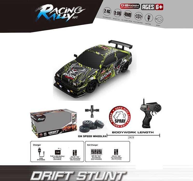 Современная радиоуправляемая машина SC 16 A 16 Эта модель масштаба 1:16 подарит захватывающие моменты игры благодаря функции дрифта и полному приводу 4WD, обеспечивающему отличную проходимость на любой поверхности. Машина оснащена яркой подсветкой и встроенным парогенератором, который добавляет реалистичности во время движения. - Размеры: 28х12х8 см - Питание от аккумулятора 3.7V с зарядным устройством в комплекте - Пульт управления работает на частоте 2.4 GHz, требует 2 батарейки типа AA (не включены) - Функция дрифта для эффектных трюков - Полный привод (4WD) для лучшей управляемости - Наличие сменных колес для различных экспериментов - Противоударный корпус для защиты во время игр