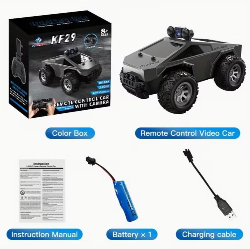 Машинка на радиоуправлении KFPLAN KF29 RC Pickup Truck 1:28 с камерой и видеотрансляцией (серый, 2.4 GHz) Снимай свои приключения с высоты капота! Реалистичная RC-машинка с камерой и прямой трансляцией на смартфон. * * * Основные преимущества: - Камера 480P + WiFi-додаток -- видео в реальном времени прямо на телефон (iOS/Android) - Масштаб 1:28 - детализированный внешний вид с металлическим блеском - Амортизация и резиновые шины -- проходить асфальт, плитку, ґрунт - LED-фари - можно регулировать, светят в темноте - Двойная коробка передач - переключай скорость в зависимости от покрытия - 2.4 GHz управление -- дальность до 50 метров, без помех - Аккумулятор 500 мАч -- до 20 мин игры, зарядка за 1 час (USB) * * * 📦 Комплектация: - RC Pickup KF29 (серый, 1:28) - Пульт управления (2.4 GHz) - USB-кабель для зарядки - Аккумулятор 3.7V 500 мАч (перезаряжаемый) - Инструкция пользователя * * * ⚙️ Технические характеристики: Параметр Значение Тип Машинка на радиоуправлении (RC Truck) Масштаб 1:28 Камера 480P, WiFi трансляция на смартфон Управление 2.4 GHz, дальность до 50 м Коробка передач Двойная (2 скорости) Фари Регулируемые, LED-подсветка Аккумулятор 500 мАч, до 20 мин, зарядка ~60 мин Размеры машинки ~15 × 8 × 7 см Вес ~300 г Материал ABS-пластик, металлические вставки, резина Цвет Серый с металлическим блеском Нужны батарейки Так, для пульта -- 2 х AA (не в комплекте) * * *