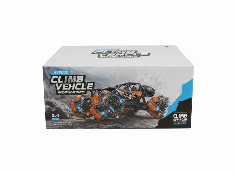 Це радіокерована машинка-всюдихід під назвою Fearless Climb Vehicle.. Призначення: Призначена для подолання перешкод і їзди бездоріжжю. Особливості: Має великі колеса з унікальним дизайном, оптимізованим для лазіння.Технологія: Працює на частоті 2,4 ГГц, що забезпечує стабільний сигнал.Унікальність: Позиціюється як «Бестрашний» автомобіль, здатний підніматися на різні поверхні.