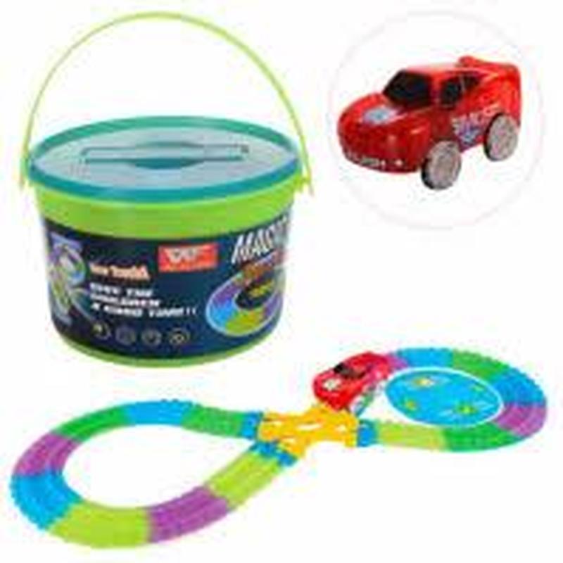 Трек 8226 свет.в темноте, машинка 9см,-свет, 103дет, на батарейке, в ведре. Размеры: 20-13-16см.
