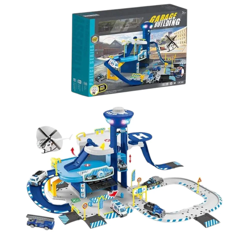 Используйте собственную фантазию для того, чтобы собрать этот мультифункциональный трек-парковку! Развлекайтесь и исследуйте все его функции вместе с друзьями. Придумывайте разнообразные сценарии игры и погружайтесь в мир веселья! Особенности: - размер полностью собранного трека 53х65.5х34см; - 3 кнопки звука: мелодия, фраза+подъем, фраза+опускание; - воспроизведение фраз на английском, указывающих в каком направлении движется лифт; - звуковые эффекты сопровождаются цветной подсветкой; - кнопка на элементе над воротами гаража выталкивает автомобиль; - регулируйте высоту одного из спусков с помощью рычага; - эффекты работают от 2-х батареек АА (не прилагаются); - 3 металлопластиковых модели спецтехники с подвижными элементами; - транспорт масштабом 1:64; - больше 60 деталей в наборе; - наклейки; - изготовлено из прочных и безопасных материалов. Размер упаковки: 62.5 см × 9.5 см × 44.5 см