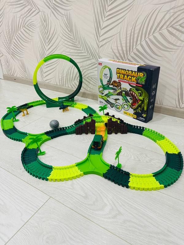 🦖🚙ГНУЧКИЙ АВТОТРЕК ДИНОЗАВР 🦖 🚙 🚙Невозможно пройти мимо: дыно трек 🦖с крутым каскадёрским трамплином 🌉 и петлей 🔂 !  Набор включает машинку 🚙на батарейках, которая передвигается самостоятельно, большой шарик, тропические деревья 🌳 , и, главное - фигурки динозавров 🦖.    Тематическая игрушка непременно понравится мальчику 🧒 и откроет простор для фантазии 💭 : можно самостоятельно определять длину и структуру трассы, придумывать трюки и определять уровень их сложности!    ❗️Длина трека - 413 см; 🚙 работает от 2 батареек типа ААА (в комплект не входят).